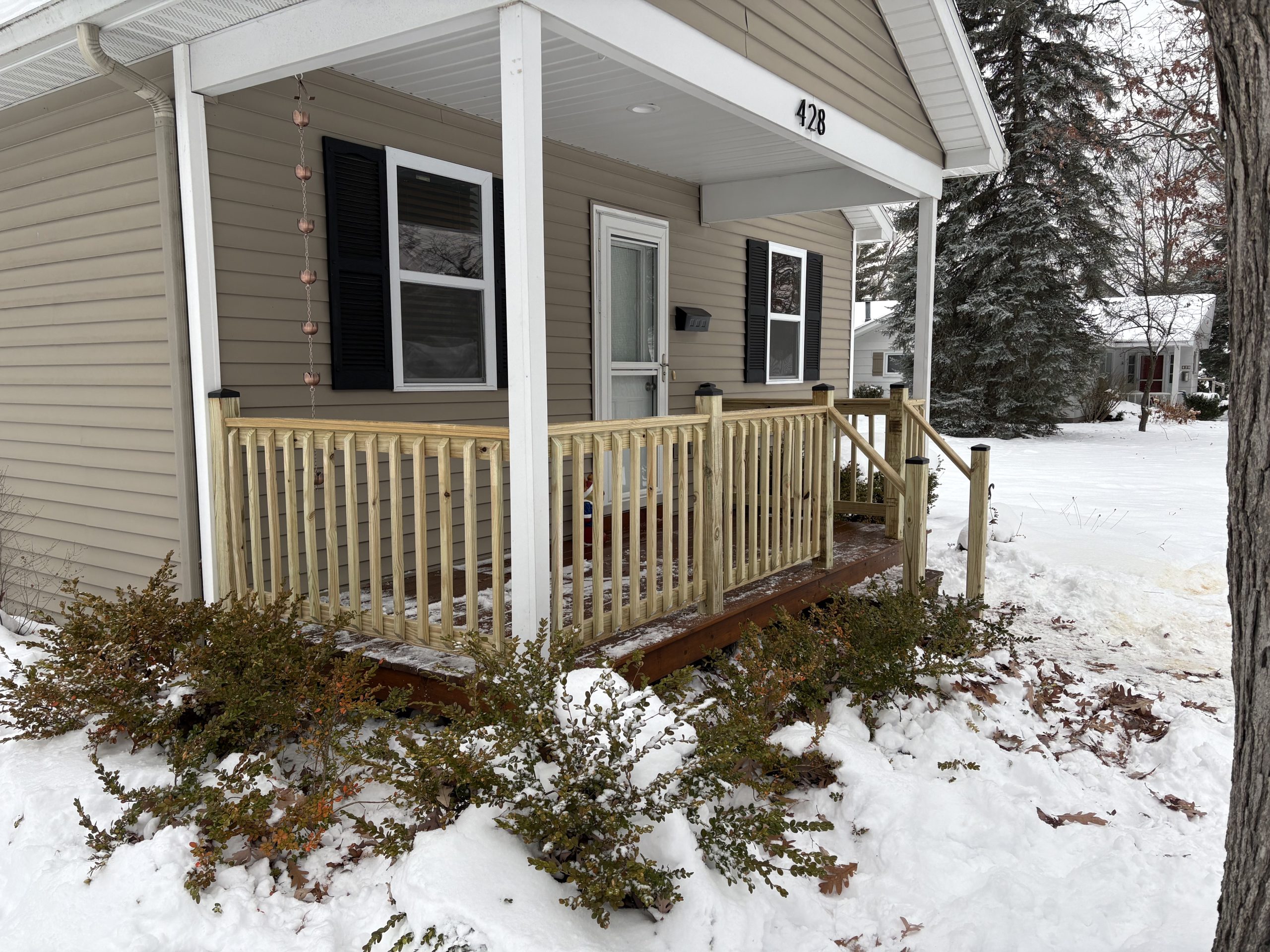 - Wood Railings: Traditional, customizable, and natural-looking; can be stained or painted